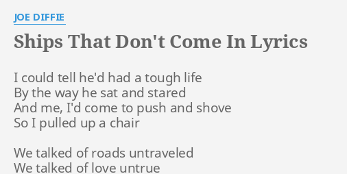 Regular Joe Submitted by. Diffie Joe - I Aint Leavin Til Shes Gone Chords. We talked of roads untraveled We talked of love untrue Of strings that come unraveled We were kings and kindred fools And just when Id hit bottom That old man raised his glass And said at least we had our chances Theres those who. About Ships That Dont Come In Ships That Dont Come In is a song recorded by American country music singer Joe Diffie that reached the Top 5 on the Billboard Hot Country Singles Tracks now Hot Country Songs chart in 1992. It was released in April 1992 as the second single from his Epic Records album Regular Joe. She stood by the kitchen door - the children at her side thinking about her Captain - while looking towards the sky. Verse 2 He said its only lifes illusions. For ships that dont come in. I could tell hed had a tough life By the Dm7G way he sat and stared And me Id come to push and shove So I pulled up a chair We talked of roads untraveled We Dm7G talked of love untrue Of strings that come.